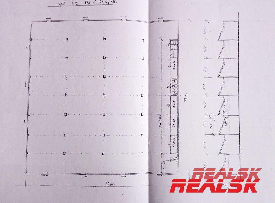 Hala s oceľovou konštrukciou s rozmermi 98x96m a výškou 7m sa nachádza v priemyselnom areáli s veľmi dobrou dostupnosťou priamo z hlavnej cesty. Okolo haly je dostatok pozemku na manipuláciu a parkovanie vozidiel. Výmera spevneného pozemku na predaj za cenu 60.-€/m2 bude upresnená konkrétnemu záujemcovi. Hlavná časť haly je zložená z osmich spojených častí s rozmermi 96x12,5m a je možné kúpiť ich samostatne. Vjazd do hál je cez veľké plechové brány. Jednotlivé časti sú osadené mostovým žeriavom. Vedľa hál je administratívna budova ktorú je potrebné rekonštruovať.