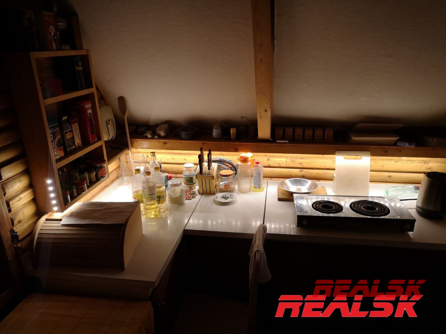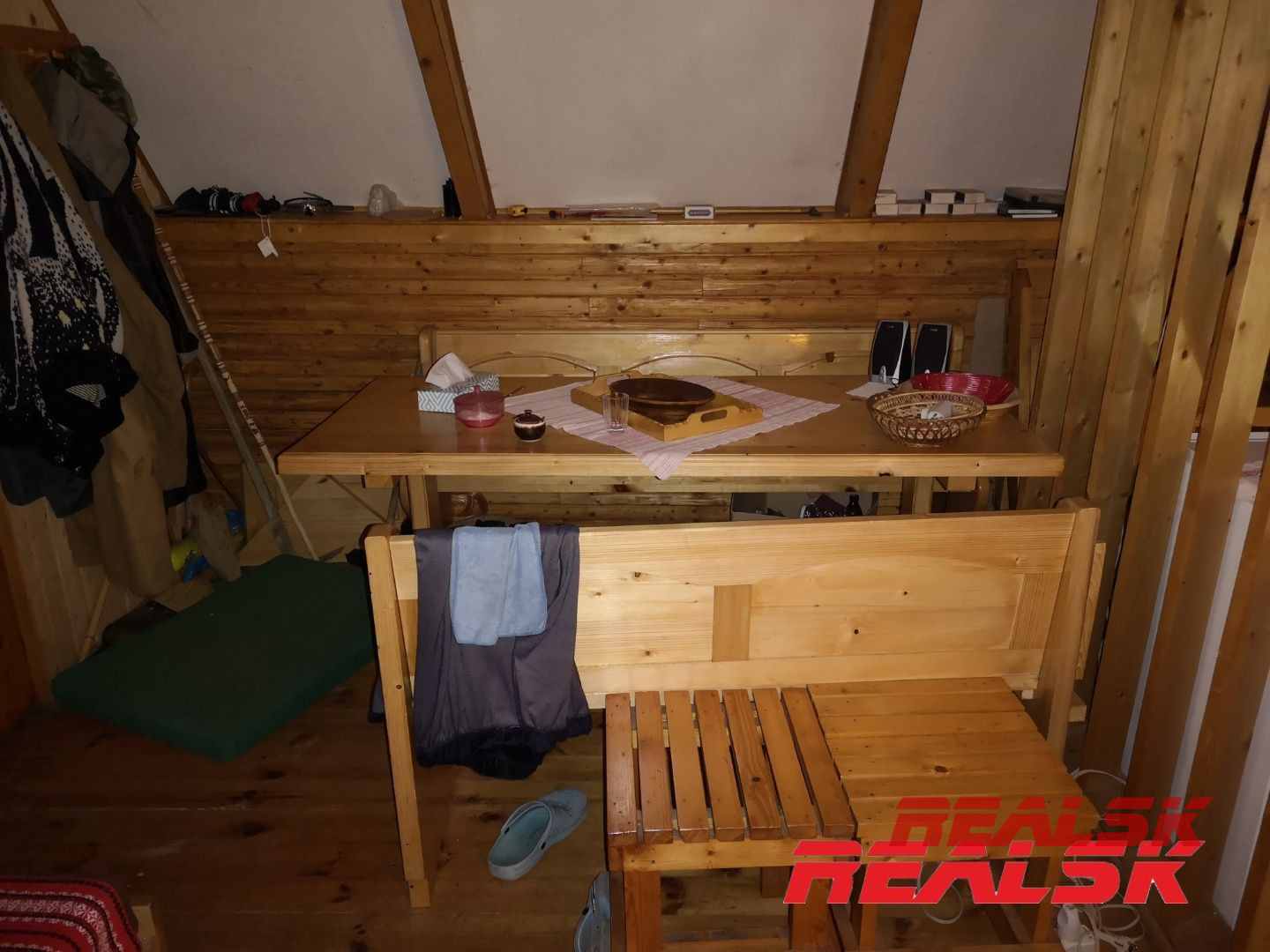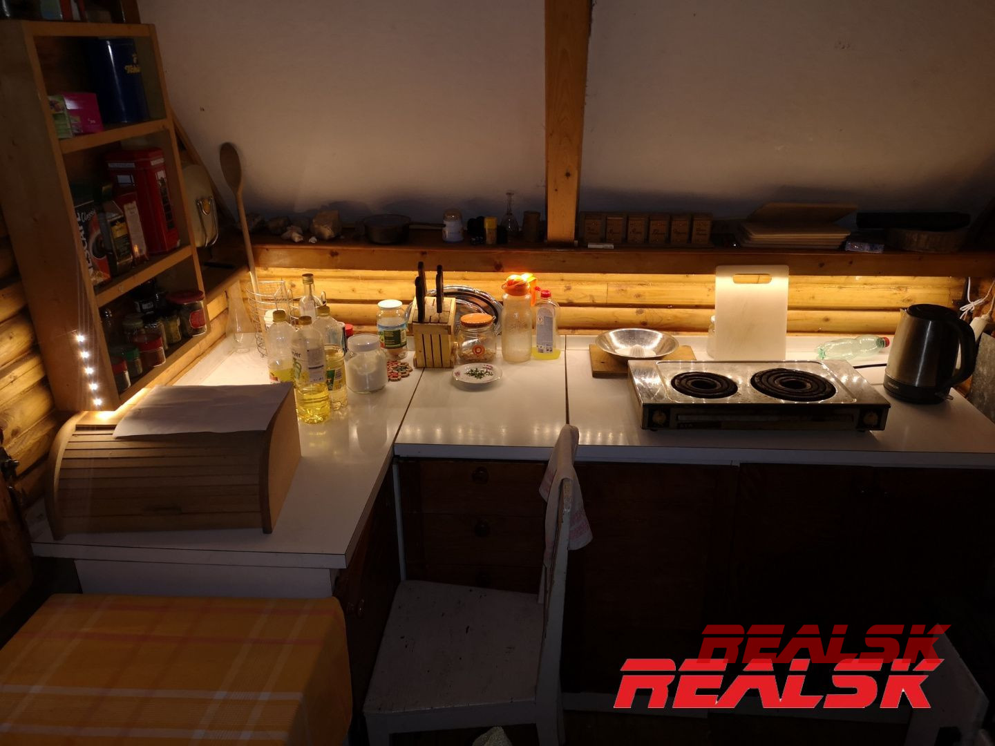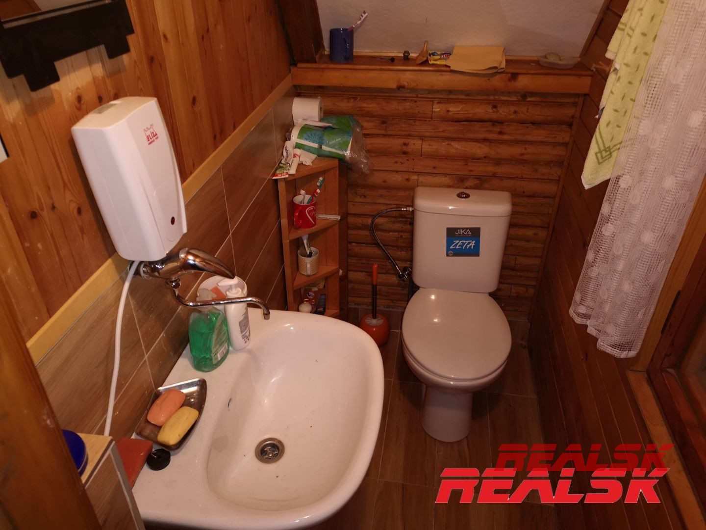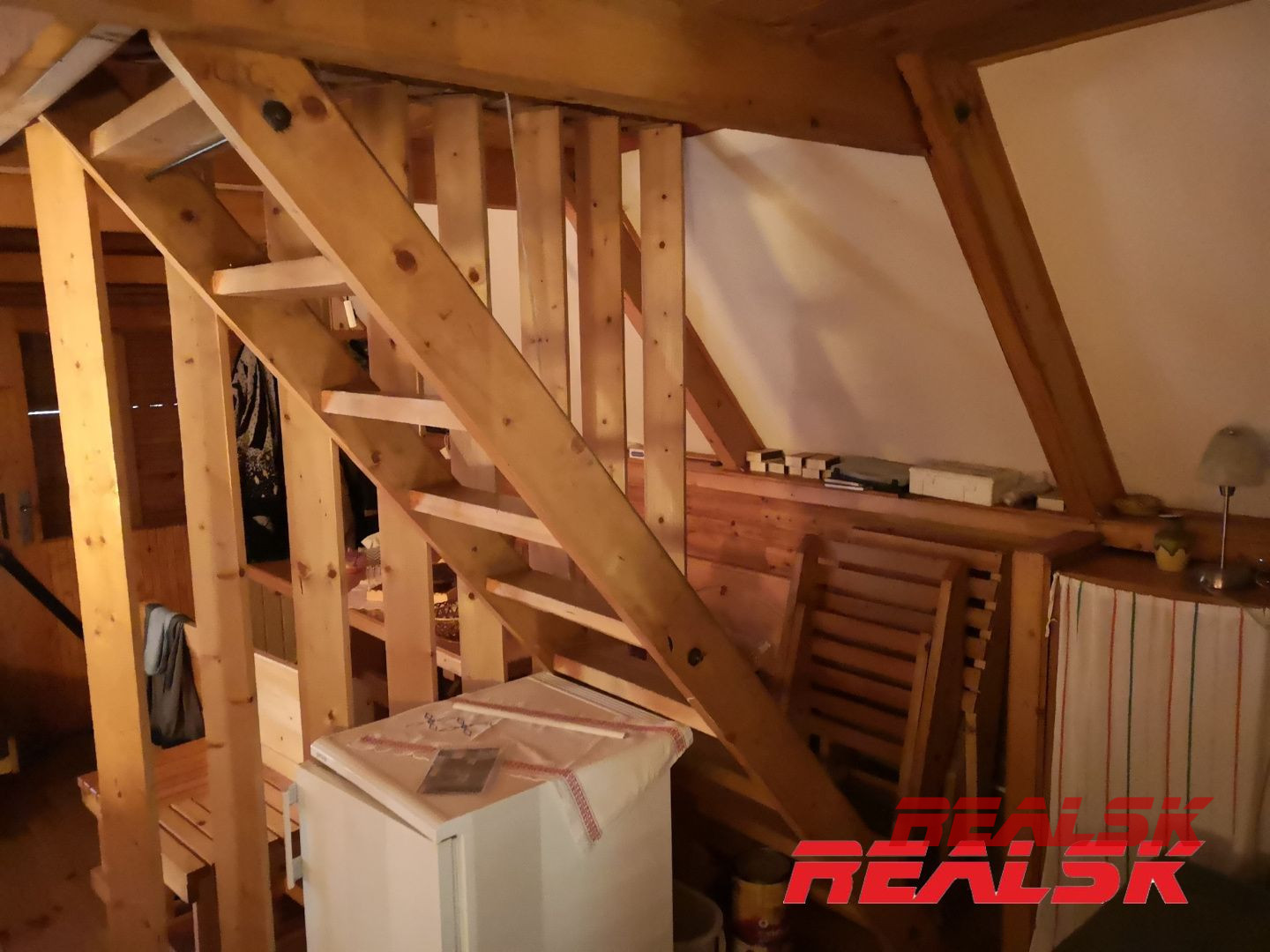 Prízemie: kuchyňa spojená s obývacou izbou (krbová pec + krb), skladová miestnosť, WC, dielňa.