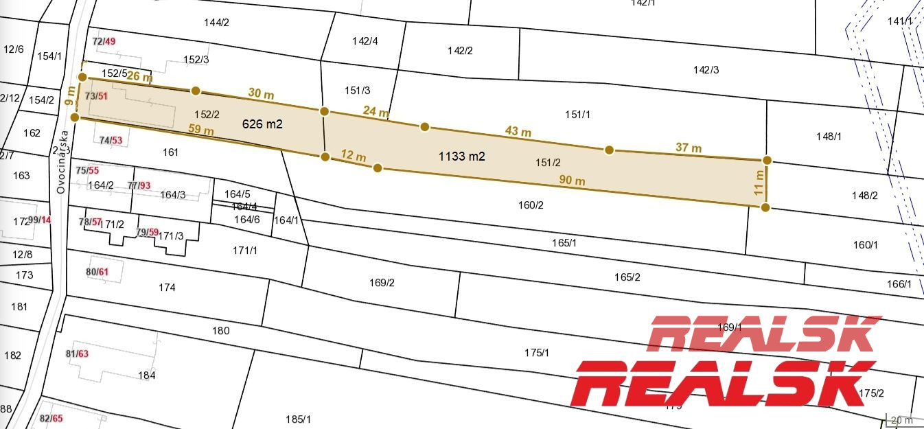 Dom sa nachádza na rovinatom pozemku o výmere 626 m2 s rozmermi 10 x 60 m. Súčasťou ponuky je aj pozemok - záhrada za domom o výmere 1133 m2, ktorý je svahovitý a má rozmery 10 x 102 m. Predmetom predaja je teda pozemok s celkovou plochou 1759 m2.