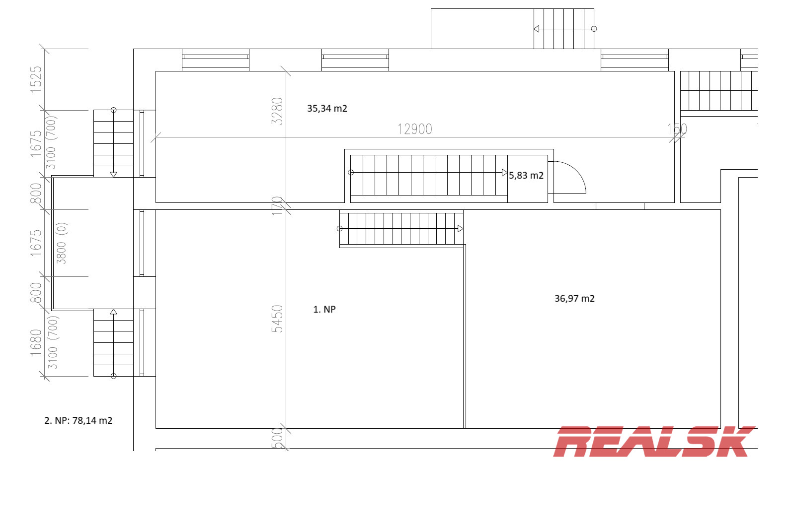 2. NP (78,14 m2): pódium z hlavnej prevádzky s plochou 36,97 m2, druhá miestnosť pre prevádzku/sklad
