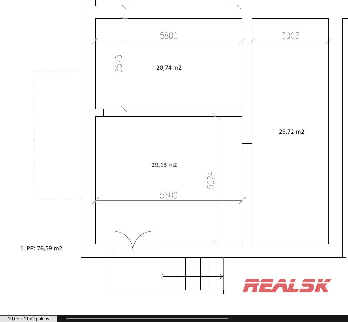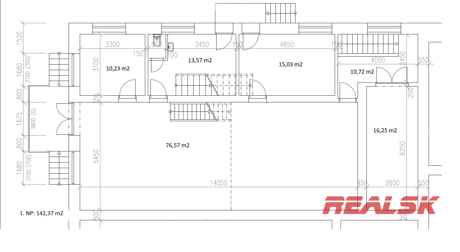 1. NP (142,37 m2): prevádzková miestnosť s plochou 76,57 m2, 2x kancelária, sklad, sociálne zázemie